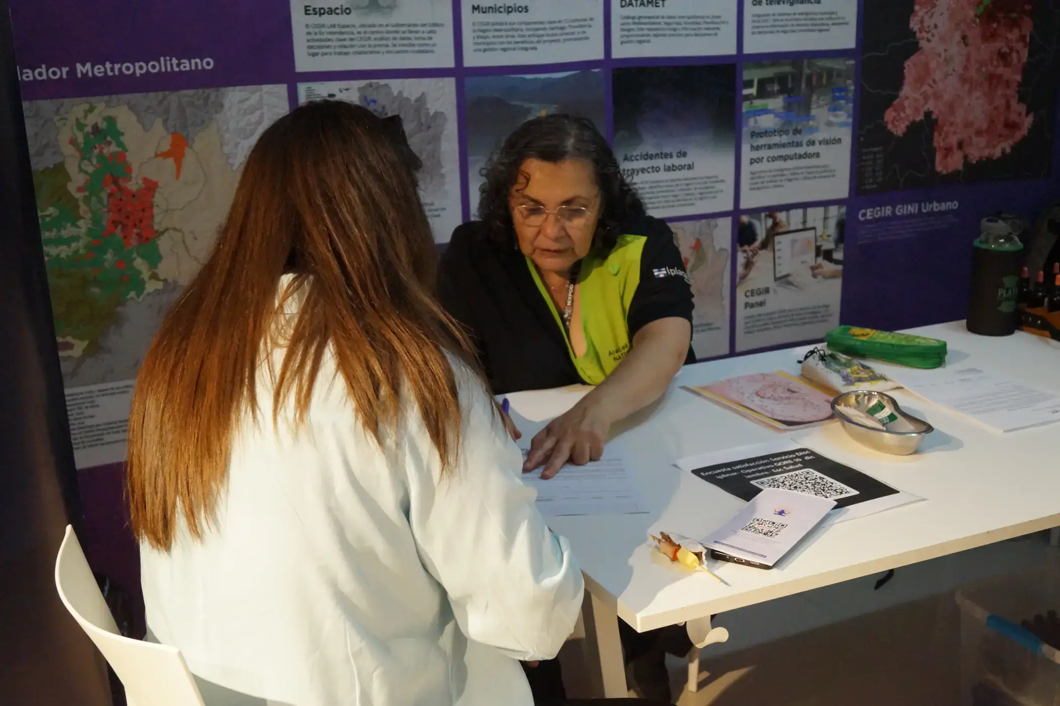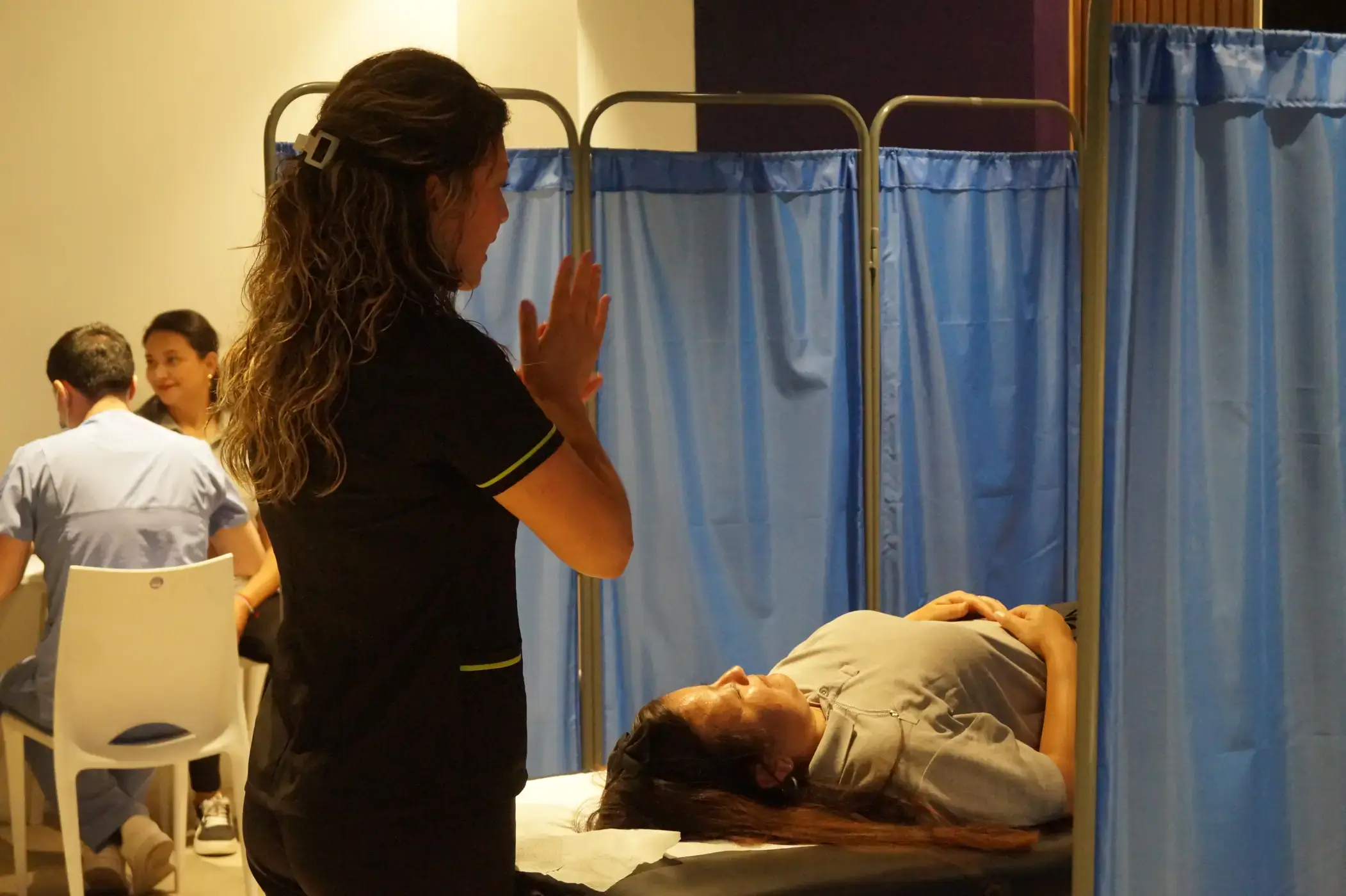 Para cerrar la jornada, se habilitó un espacio de coffee break y terapias complementarias, desarrollado por el apoyo de estudiantes de la carrera de Naturopatía, Masoterapia y Ténicos en Enfermería de IPACEX, diseñado especialmente para fomentar el autocuidado de las asistentes. En este espacio, las participantes pudieron acceder a sesiones de reflexología, flores de Bach, masoterapia y auriculoterapia, además de exámenes de medicina preventiva, como control de presión arterial y glicemia.